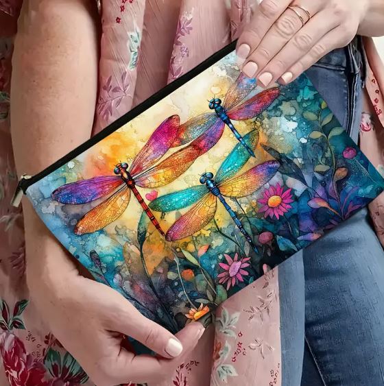 Adorned with a kaleidoscope of vibrant dragonflies dancing among wildflowers, this artistic pouch is more than just a bag—it’s a symbol of beauty, change, and freedom.