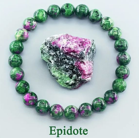 Adorn your wrist with the natural beauty of Epidote, a striking blend of lush green with flashes of pink and purple hues. Each bead holds the energy of transformation, helping you align with positivity and embrace your personal evolution.