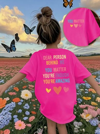Short-sleeve t-shirt features a colourful and inspiring message for the person behind you