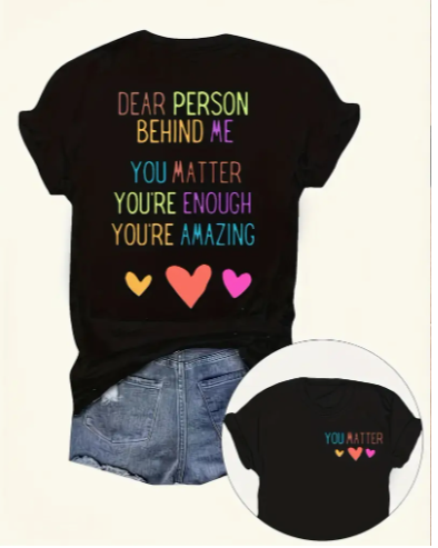 Connect with those around you through kindness. This black short-sleeve t-shirt features a colourful and inspiring message for the person behind you. A simple reminder that everyone matters.