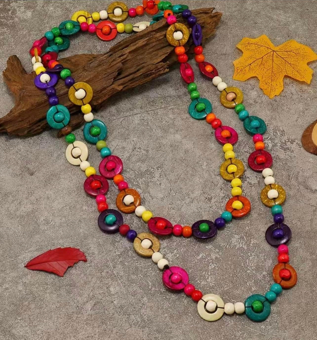 Imagine: The warm, organic feel of smooth wooden beads intricately woven with authentic coconut shell pieces, each one unique and telling its own story. This necklace beautifully embodies a retro bohemian spirit, exuding an earthy charm that's both grounding and effortlessly stylish. Each bead and shell is thoughtfully placed, creating a tactile and visually rich piece that's genuinely handmade.