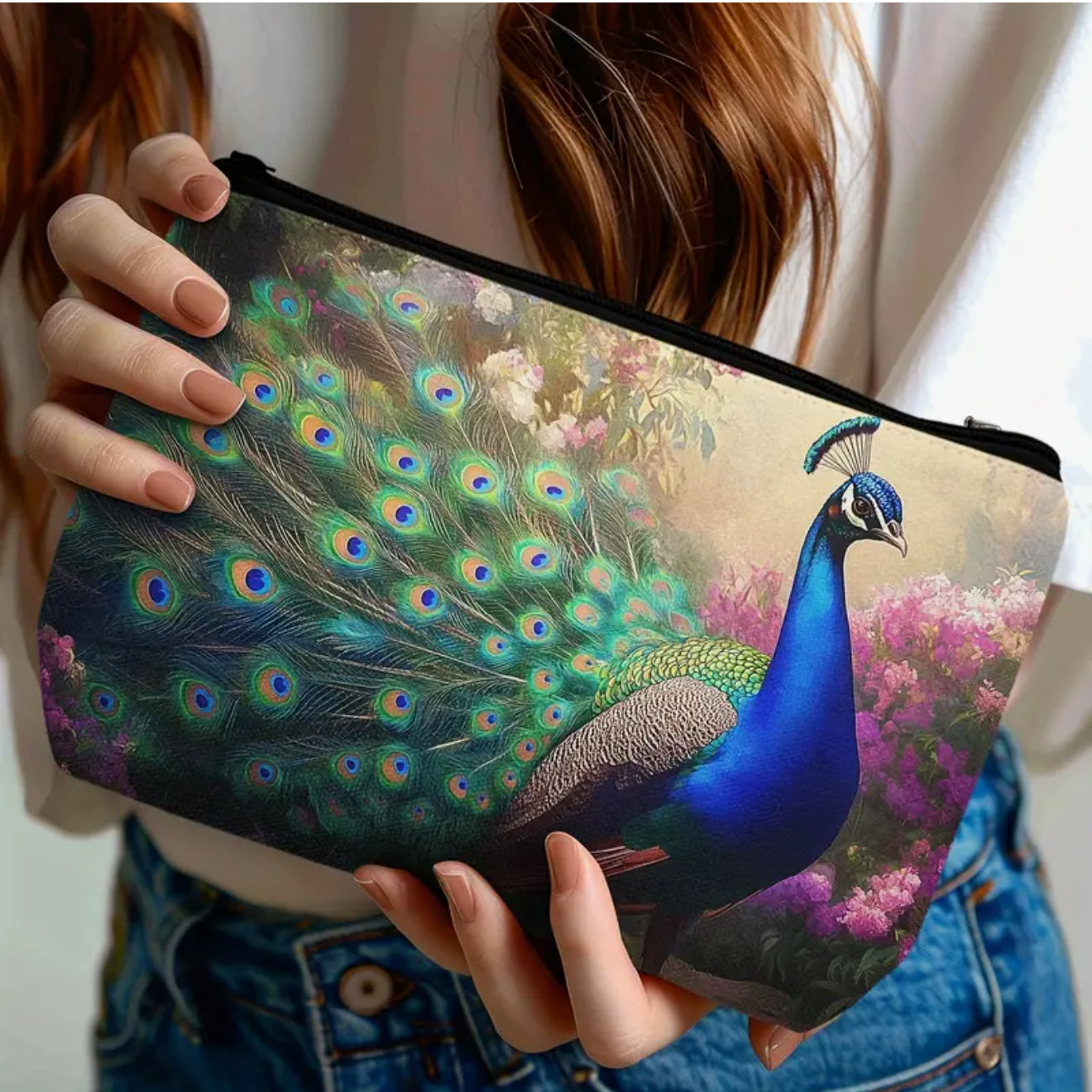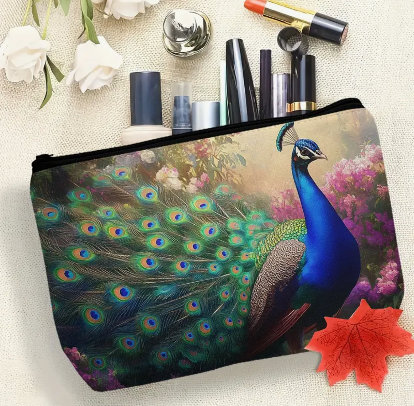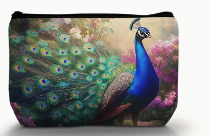 Add a touch of vibrant spirituality to your life with our Vibrant Peacock Cosmetic Bag!