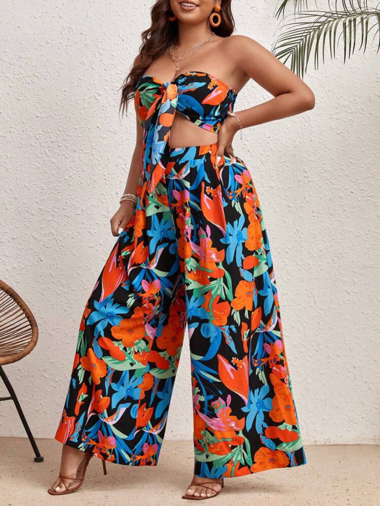 Embrace the vibrant floral design and the playful knot front detail of the tube top. Paired with our super comfortable wide-leg pants, this outfit is perfect for everything from beachside strolls to weekend markets.