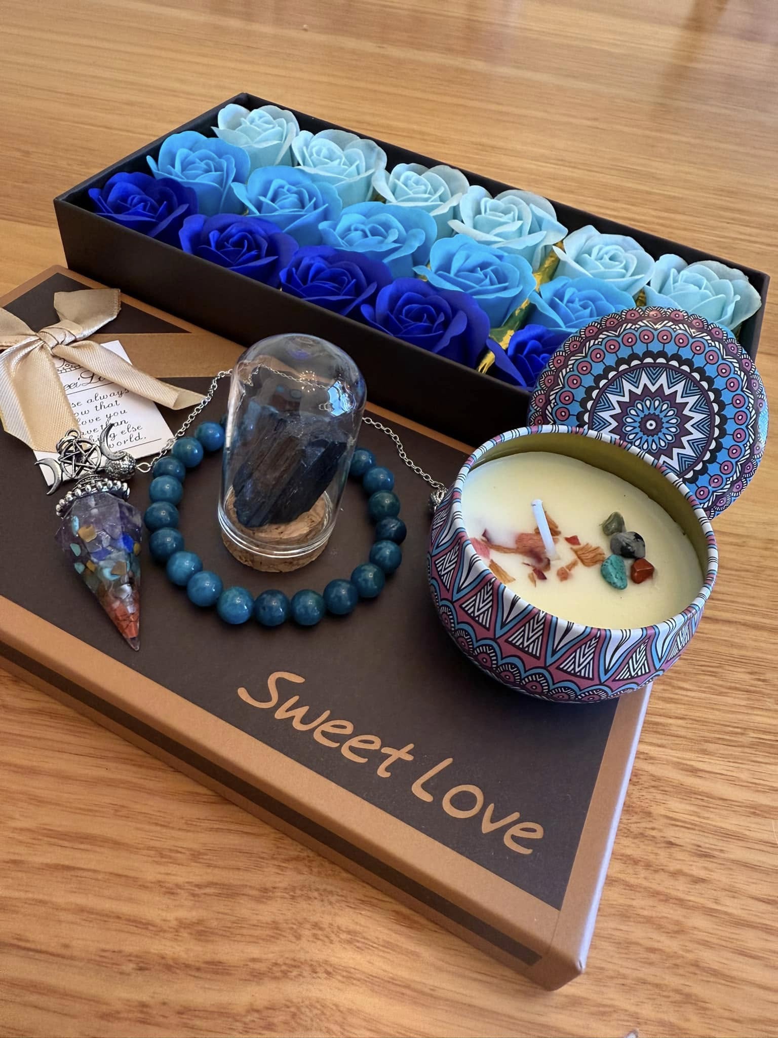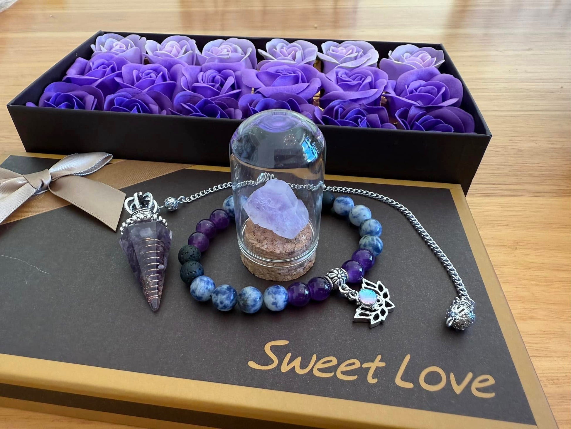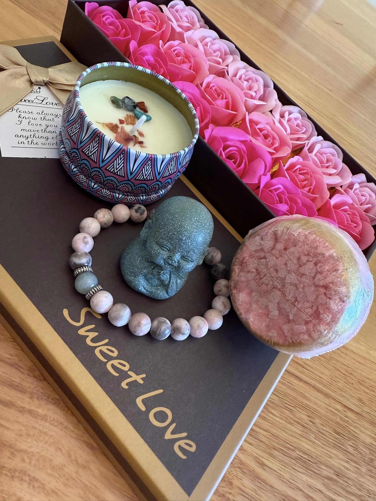 Three handpicked wellness items designed to support mindfulness and soothe the soul — such as a crystal energy bracelet, pendulum, crystal, mini Buddha, crystal bookmark/incense holder, or your choice of a candle or bath bomb