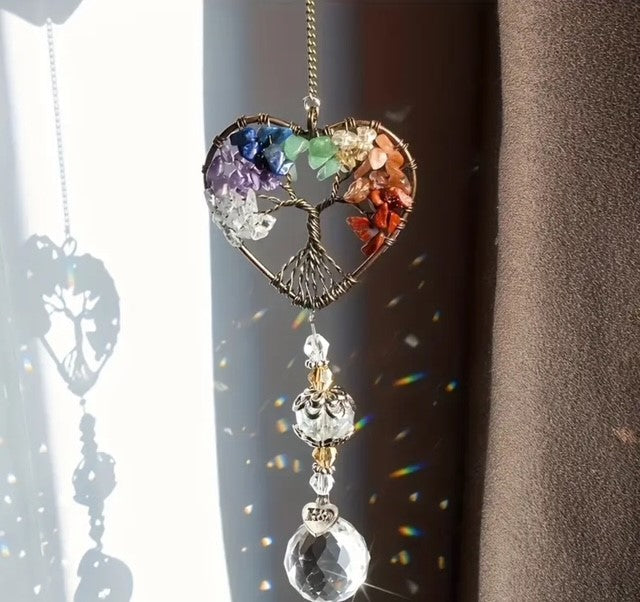 A stunning blend of light, energy, and symbolism, this Rainbow Crystal Sun Catcher brings harmony and beauty into any space. Featuring a Tree of Life design and a heart-shaped ornament, this piece reflects dazzling rainbows, filling your surroundings with uplifting energy.