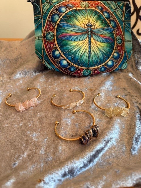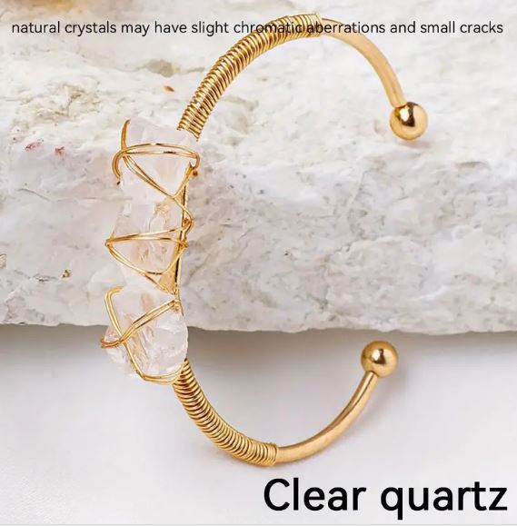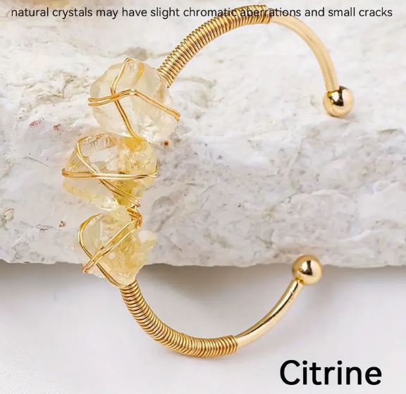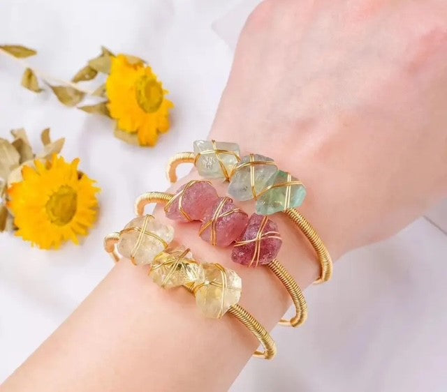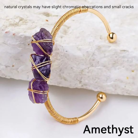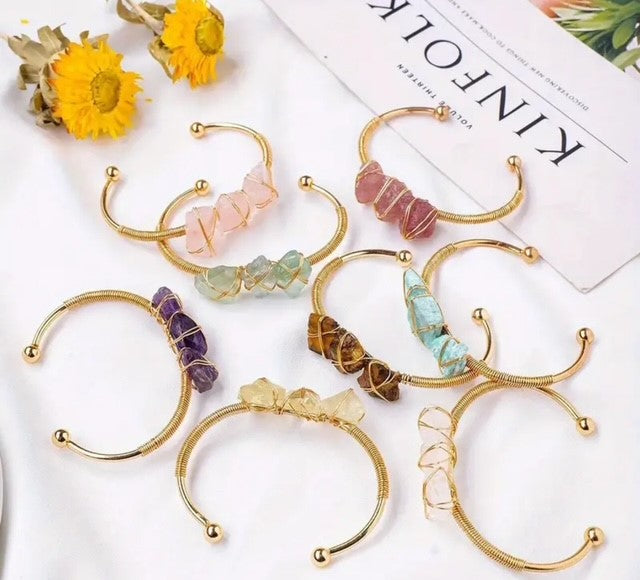 Bring balance and beauty into your life with our Raw Crystal Healing Bracelet from the Runyangshi Collection. Each bracelet features a trio of natural raw stones, elegantly wrapped in gold wire on a flexible open bangle. Ideal for women who love crystals, spirituality, and holistic living.