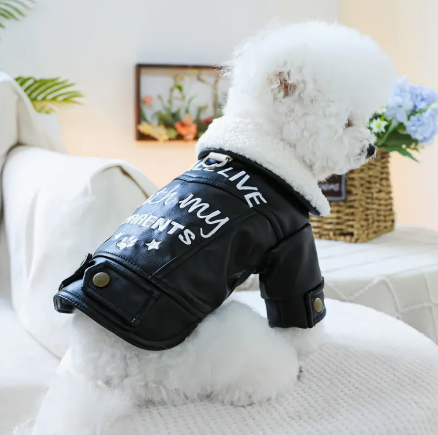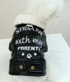 Introducing the ultimate black leather-look dog coat, custom-emblazoned with the most relatable phrase of our generation: "STILL LIVE WITH MY PARENTS."