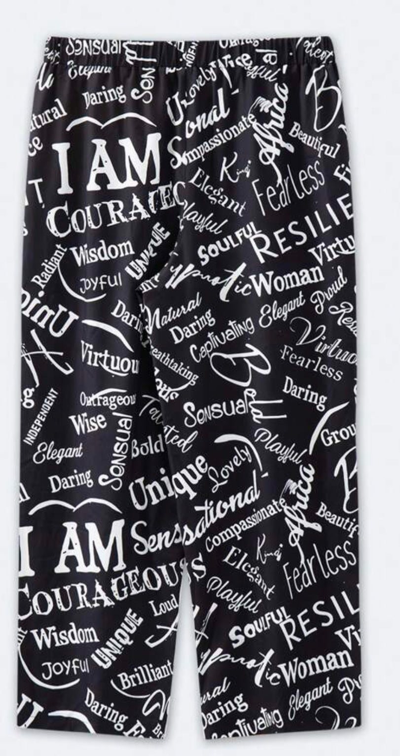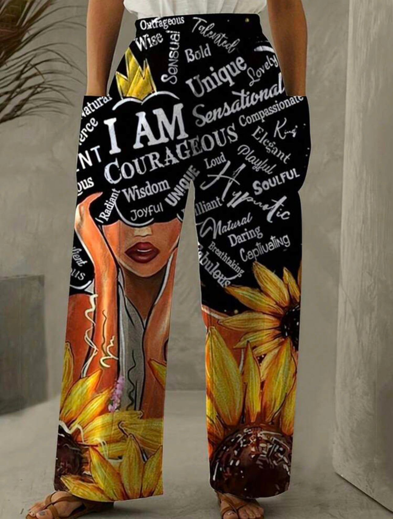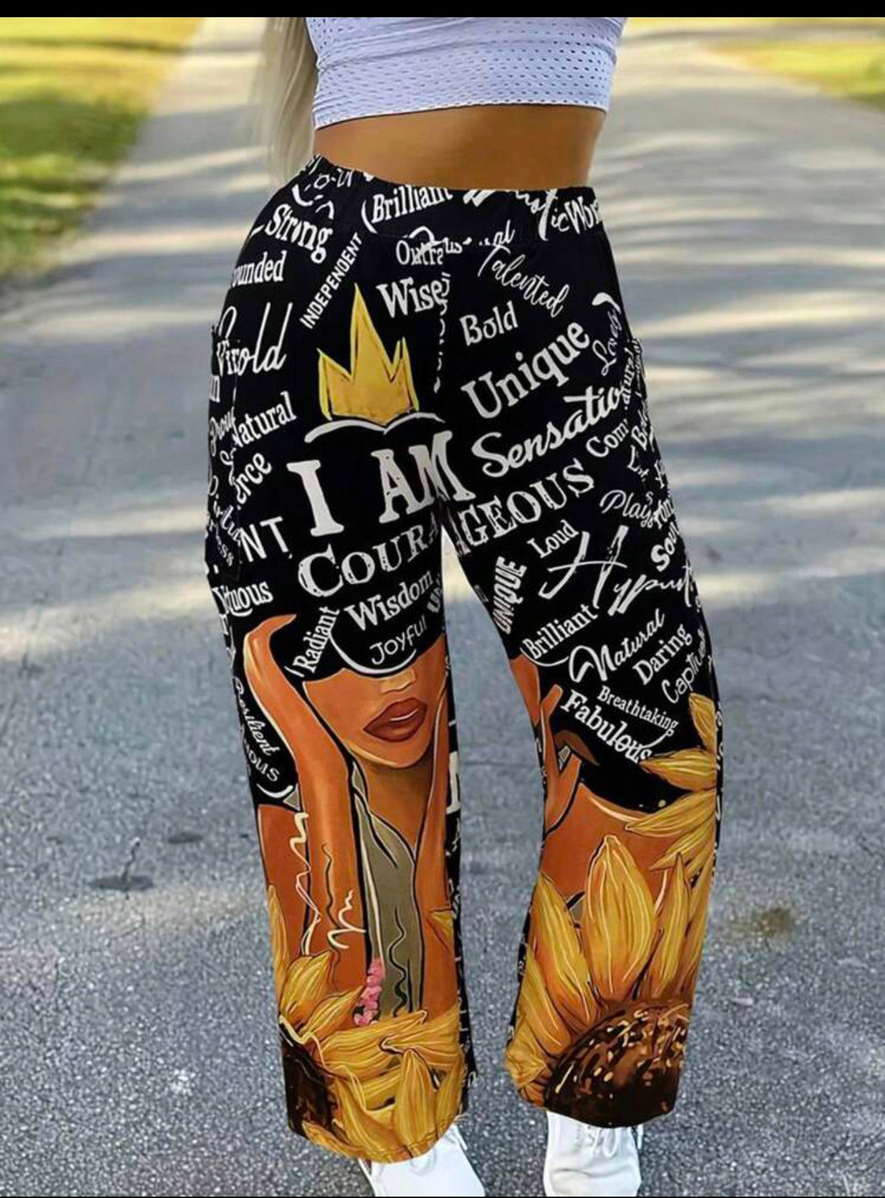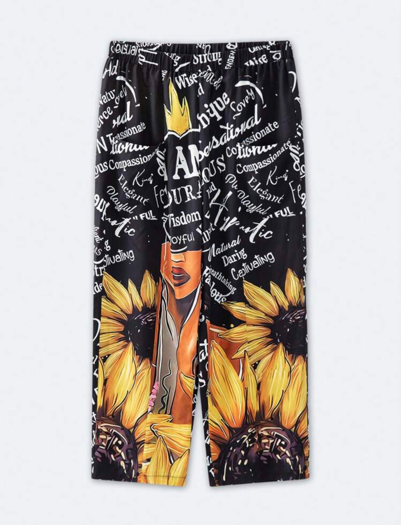 Imagine the vibrant golden hues of sunflowers brightening your day, while uplifting words woven into the design empower your spirit. Crafted for comfort and style, these pants are perfect for chasing your dreams, embracing new adventures, or simply adding a burst of joy to your everyday.