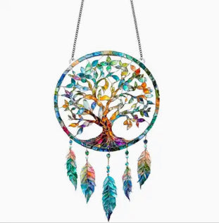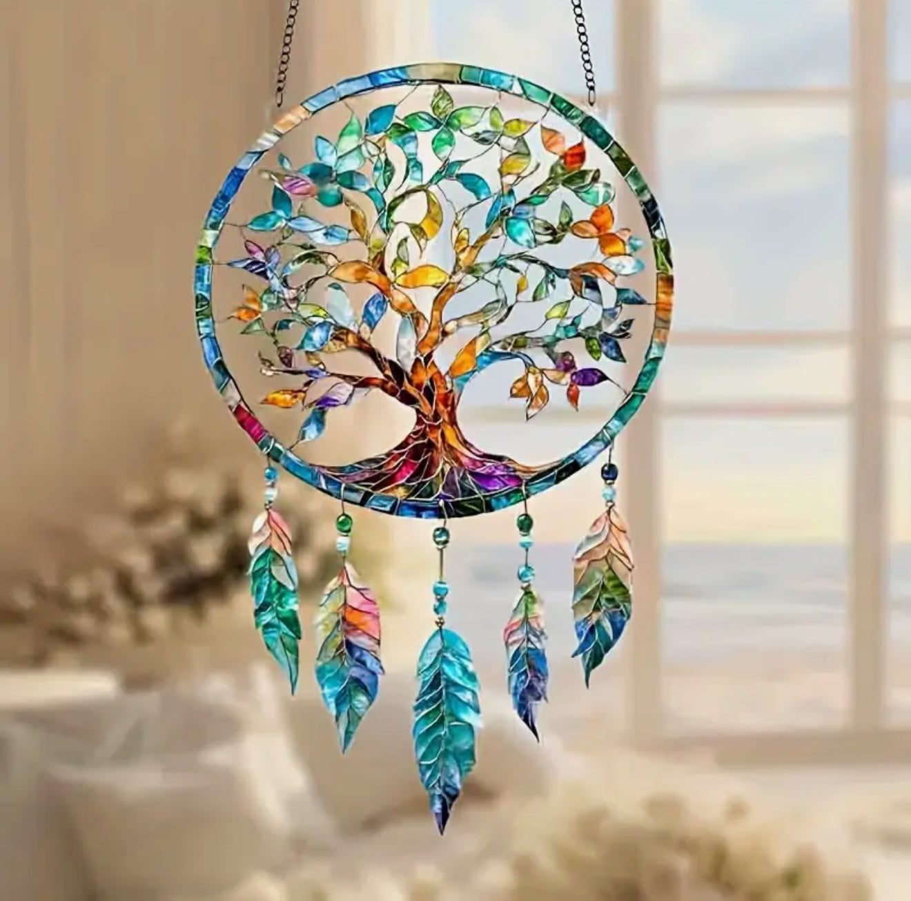 Elevate your space with this beautiful Tree of Life Hanging Ornament, inspired by the symbolism of dreamcatchers and the grounding energy of nature. Crafted in a vibrant 2D design with intricate detailing, this piece features a rainbow-coloured tree framed in a circular design, finished with five delicately beaded feather charms.