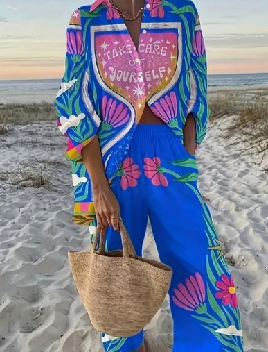 👗 Effortless Style – Coordinated long sleeve shirt and relaxed wide-leg pants, designed for chic vacation vibes.